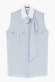 Vertical stripe print. Pleat detailing. Bow collar. Concealed front fastening. Chest flap pockets. Sleeveless. Straight hem.