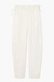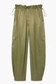 Recycled polyester  satin from manufacturing offcuts. Loose fit, wide leg. Two side pockets, two flap pockets on back and on legs. Adjustable waist and ankles with drawstring and snaps. Embroidered crocodile on back.