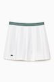 This tennis skirt, tried and tested by Lacoste players, features wide, elegant pleats, stretch fabric for freedom of movement, and Ultra Dry moisture-wicking technology. A blend of Lacoste style and technical prowess. - Recycled polyester pique from manufacturing offcuts - Ultra Dry moisture-wicking technology - Length: 14” / 35cm from waist - Integrated shorts for full freedom to move - Silicone crocodile on front