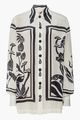 Collared neckline. Buttoned placket. Long balloon sleeves. Cinched wrists. Garden-inspired pattern.