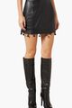 Vegan leather mini skirt. Fitted style. Knot trim detail. Exposed back zipper. Lined style.